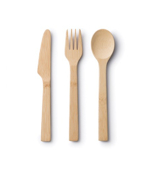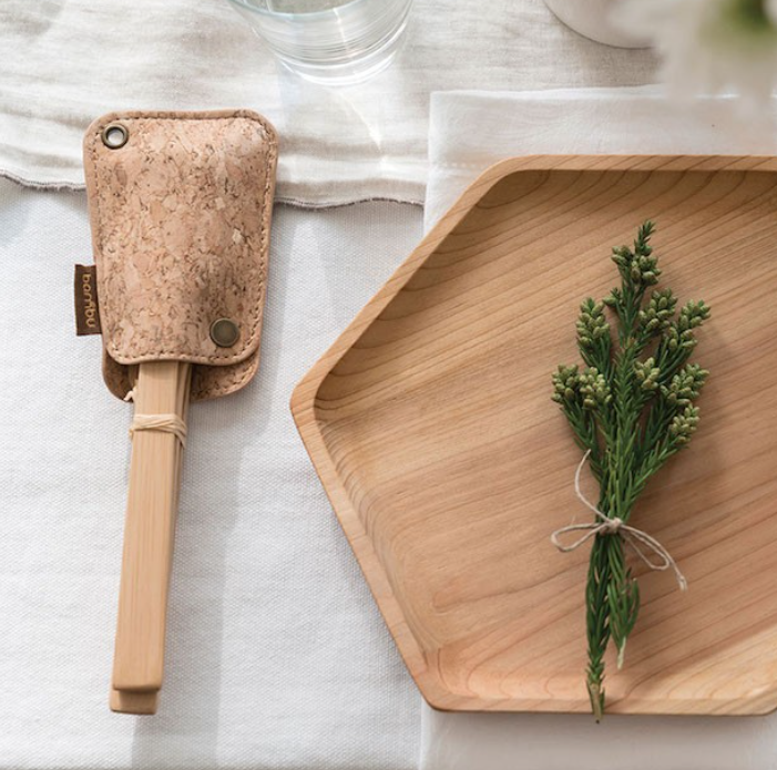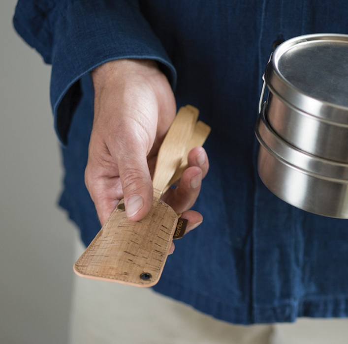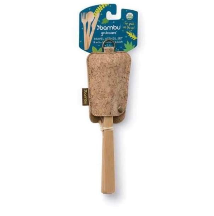 Keep your reusable, knife, spoon and fork set ready for on-the-go eating. The heads of the utensils are protected with a cork pouch.