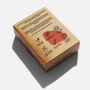 Comes in a 100% recycled unbleached Kraft box, printed with Soy Ink, which is 100% recyclable.