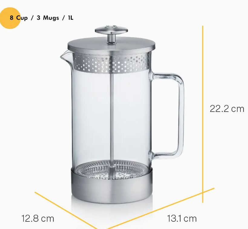 Meet the Core Coffee Press – your durable, sleek solution to a perfect brew! Available in two practical sizes, this cafetiere is designed for coffee enthusiasts who appreciate both style and substance. What makes it outstanding? It's proudly 100% plastic-free, embodying our commitment to sustainability. Designed and developed in the UK for people that love medium strength coffee, the Core Coffee Press is crafted from high-quality borosilicate glass and, you guessed it, premium stainless steel.