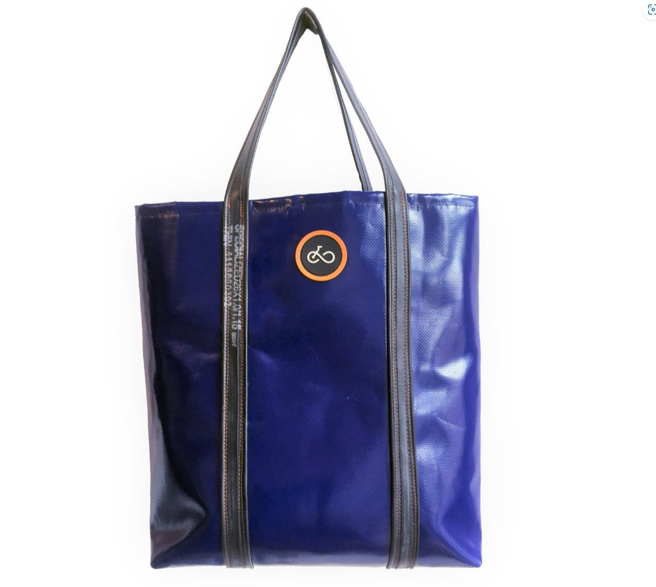 This bag is made from super-tough waterproof, lorry-curtain fabric, which was going to be thrown away until we rescued it! It’s the perfect size for your weekly shop, your laptop and lunch for the office, or for your gym trip. We love the comfy recycled inner-tube handles which are strong but never cut into your hands when the bag is full of heavy things.