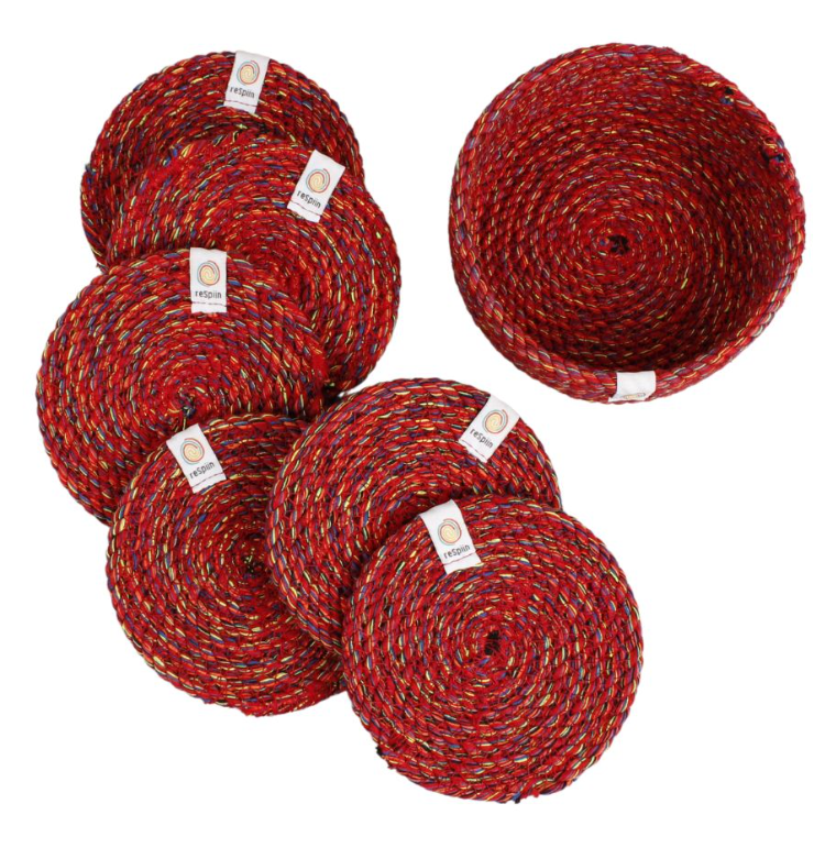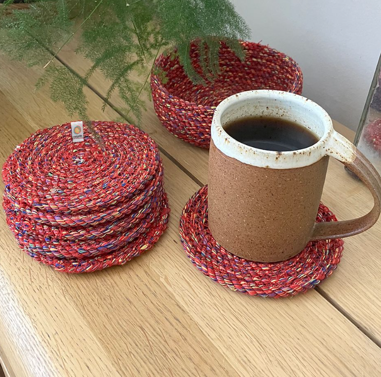 Respiin Recycled Cotton Coaster Set. Sturdy, colourful and practical, this set of recycled cotton coasters comes in its own handy holder. Scatter them on tables large and small to keep surfaces clean and protected.