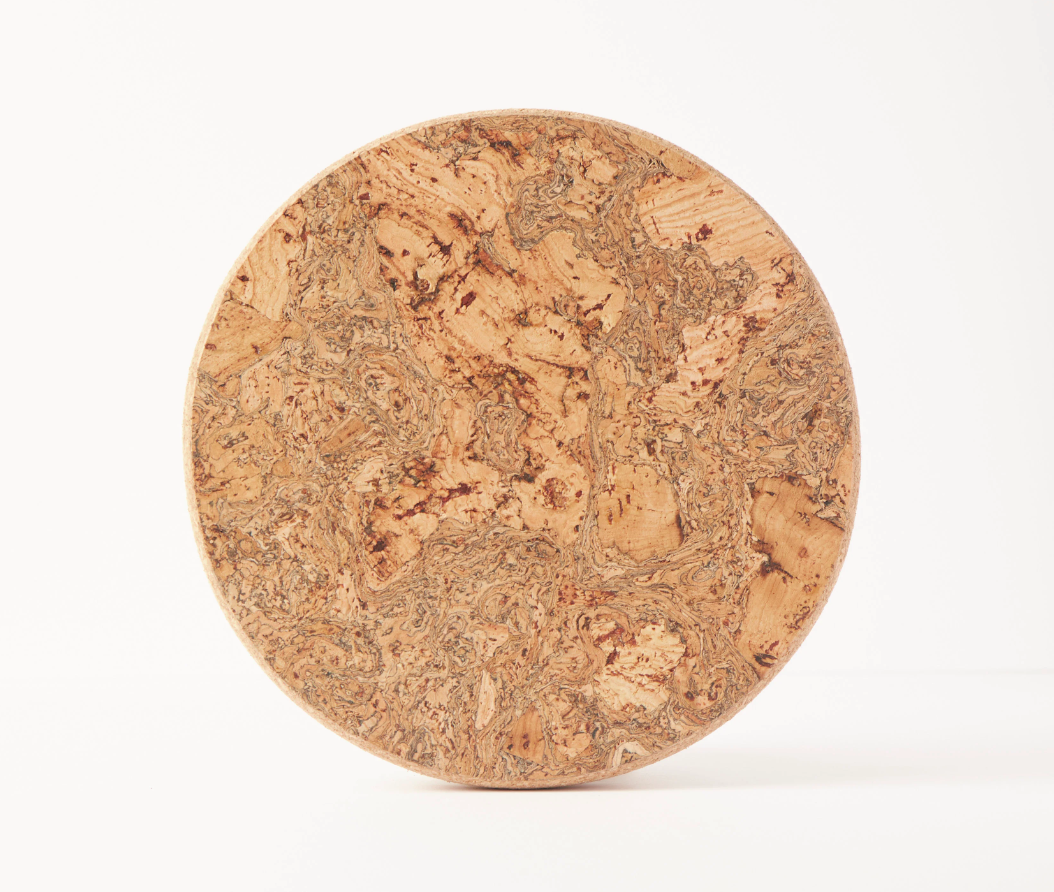 Made from organic cork, a sustainable and regenerative material, this collection enhances the natural patterns of cork with a light ink smoking process.