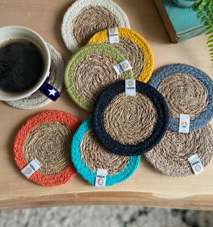Made from sustainably sourced seagrass and jute. Coloured with non-toxic dyes and tested safe for food contact. Each mat has a small fabric ReSpiin label stitched onto the edge.