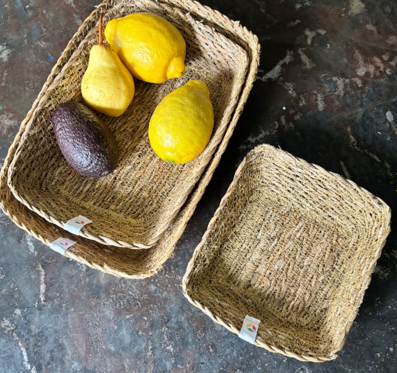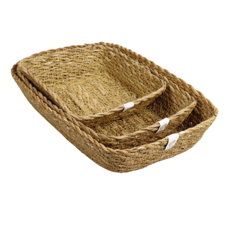 Respiin Seagrass Rectangular Basket Set in Natural. Hand woven, lightweight and strong, this set of three Seagrass baskets has two rectangle sizes and one square. Naturally smart and versatile, these trays are useful in the office, kitchen and all around the home.
