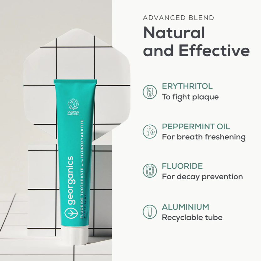 Experience the future of oral care with our Fresh Mint Toothpaste, formulated with a powerful combination of hydroxyapatite, fluoride, and erythritol. This advanced blend is designed to deliver superior protection, helping to remineralise tooth enamel, prevent cavities, and gently polish teeth.